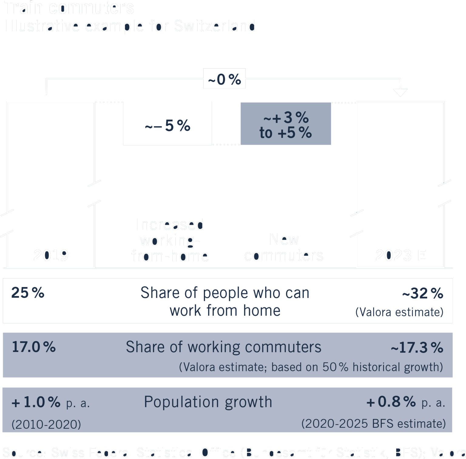 Before the crisis, people in Switzerland commuted 6.4 times a week on average. Even though more people will be working from home in the future, Valora estimates that customer footfall at public transport hubs will only fall by around – 5 % in the medium term. However, this decline is likely to be offset by population growth and the associated increase in public transport passenger numbers. The Swiss Federal Statistical Office expects an annual increase of + 0.8 % in Switzerland’s population between 2020 and 2025 (+ 1.0 % between 2010 and 2020). The proportion of the population travelling to work by train is also likely to increase by around + 0.3 percentage points by 2023. Additional support can be expected from the planned expansion of the public railway infrastructure, which will also help reduce the high traffic volume on the roads.