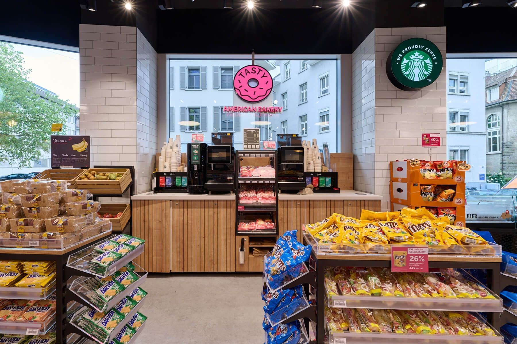 Modernes Convenience-Format für Hochfrequenzlagen wie Bahnhöfe oder Tankstellen mit grossem Food- und Frischeangebot sowie regionalen Produkten.
