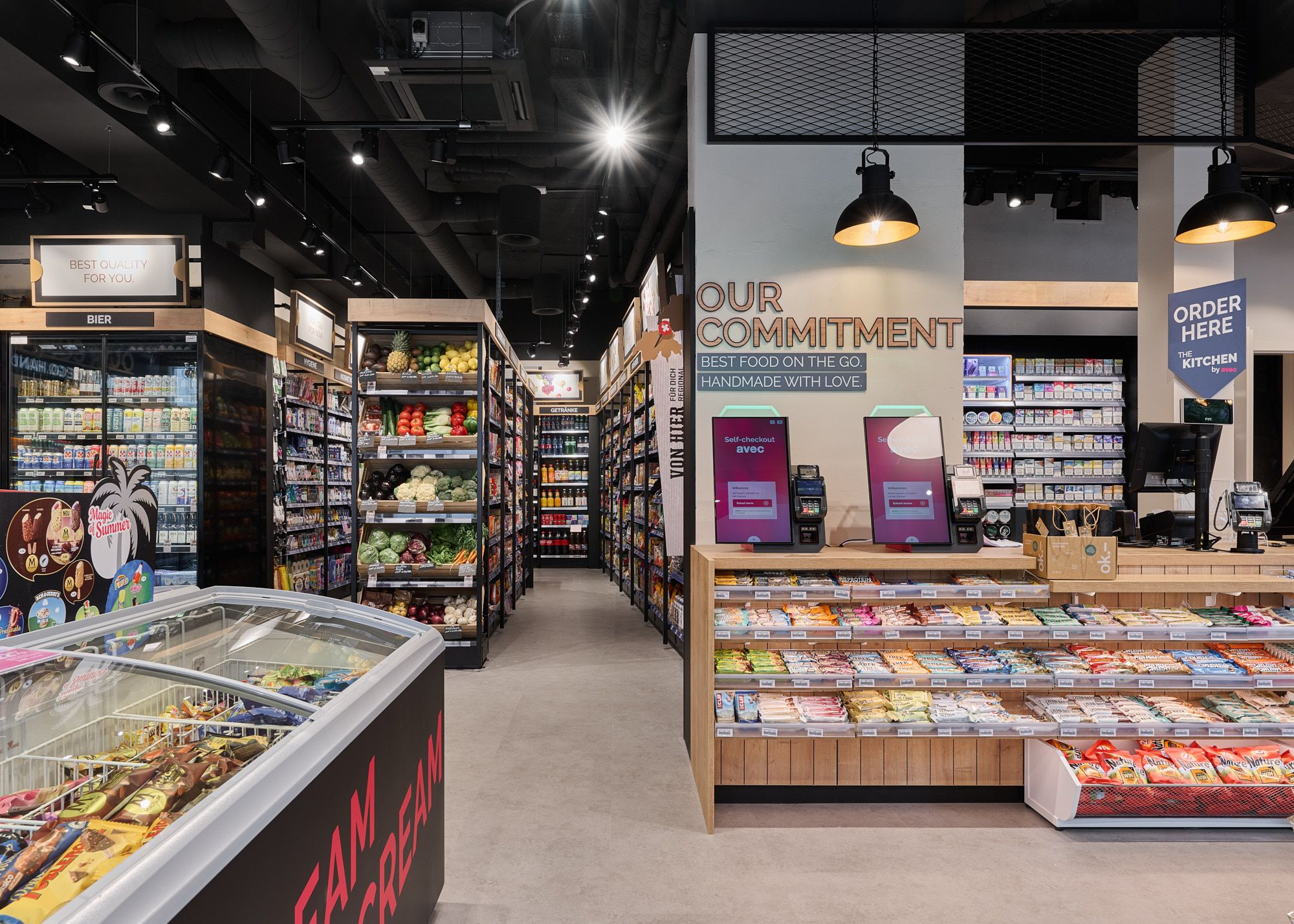 In der offenen Küche werden von Montag bis Samstag warme und frische Gerichte für unterwegs zubereitet. Nebst traditionellen Gerichten wie Pizza, Chicken Wings, Hamburger oder Fleischkäse, bietet der neue avec ein breites veganes Angebot wie Dürüm-Falafel, Vegi-Hotdog, Vegi-Burger, Hummus sticks oder Couscous Oriental an.