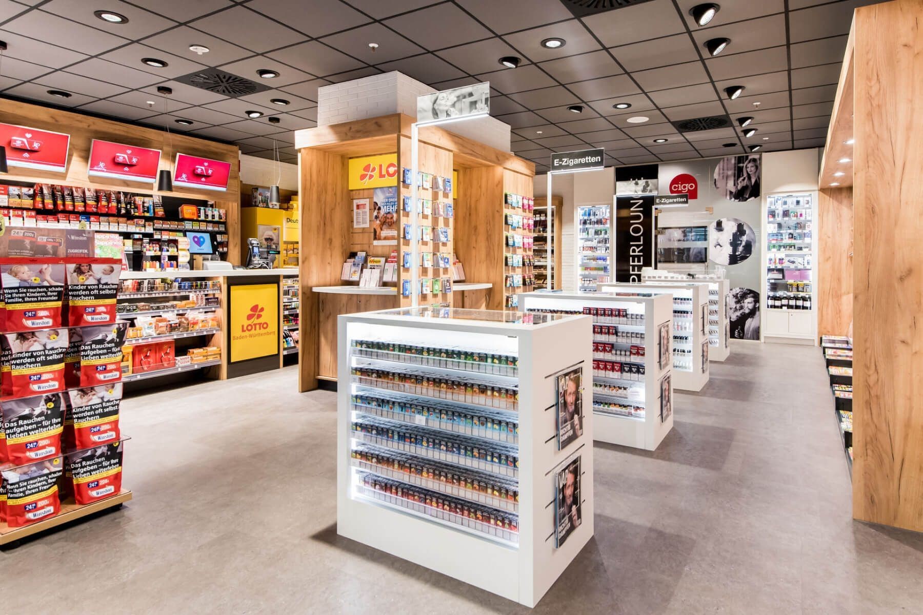 Besides the usual cigarette brands, cigo offers cigars, cigarillos, rarities and smoking accessories. Its range also covers alternative tobacco products, for example e-cigarettes, tobacco heating systems and chewing tobacco. Customers can also browse an extensive range of press products plus the usual peripheral assortment. Some stores also provide service points for lottery or postal services.